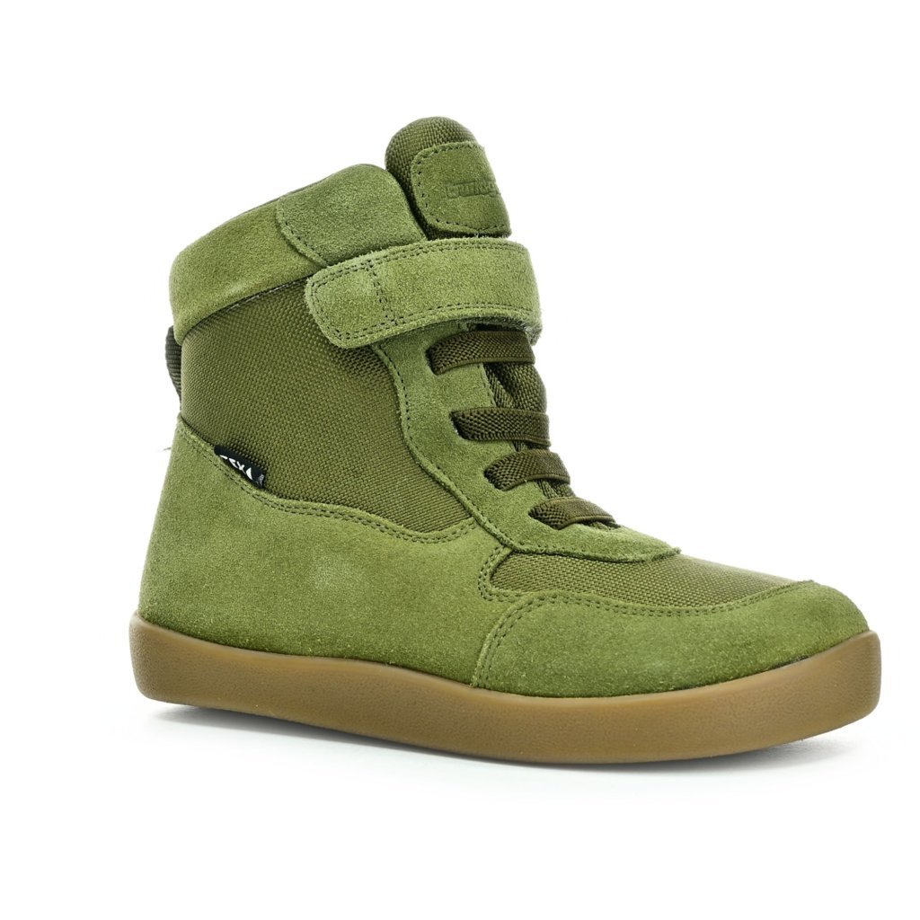 Die grünen Winterbarfußstiefeletten der dänischen Marke Bundgaard sind dank Membran und weichem Wollfutter ideal für jeglichen Winterspaß.